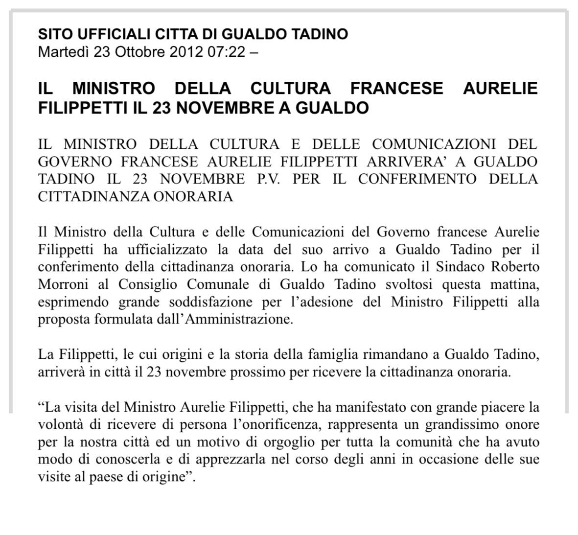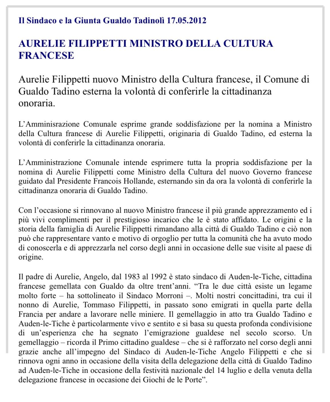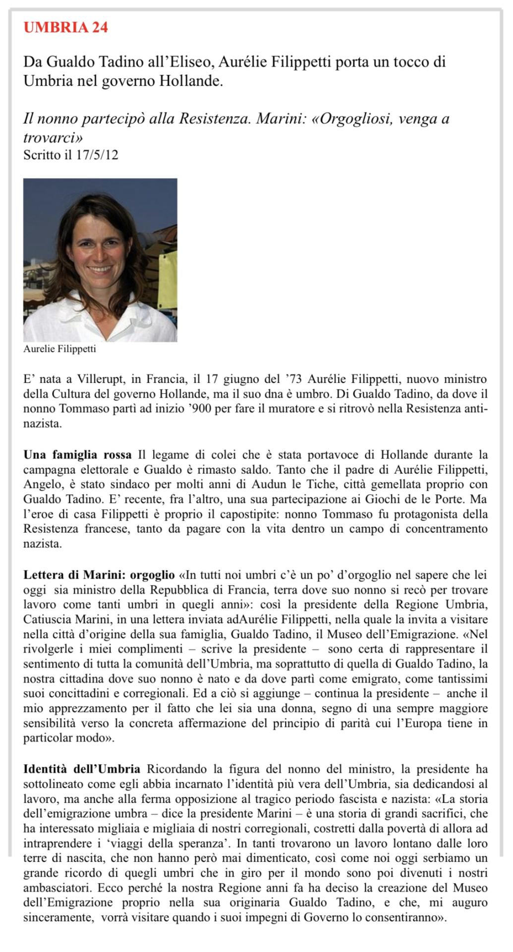 Le 23 novembre dernier, la ministre de la Culture Aurélie Filippetti était à Gualdo Tadino, le village natal de son grand-père Tommaso, mort en déportation. C’est ainsi que, 22 ans après son père Angel, la ministre française a été faite citoyenne d’honneur de notre ville jumelle en Italie.