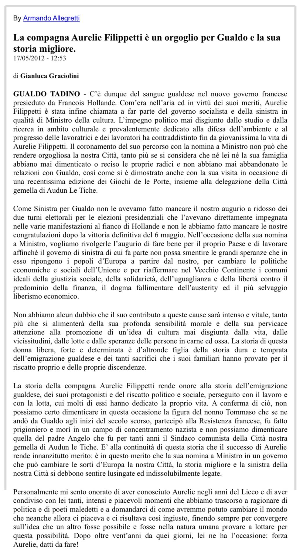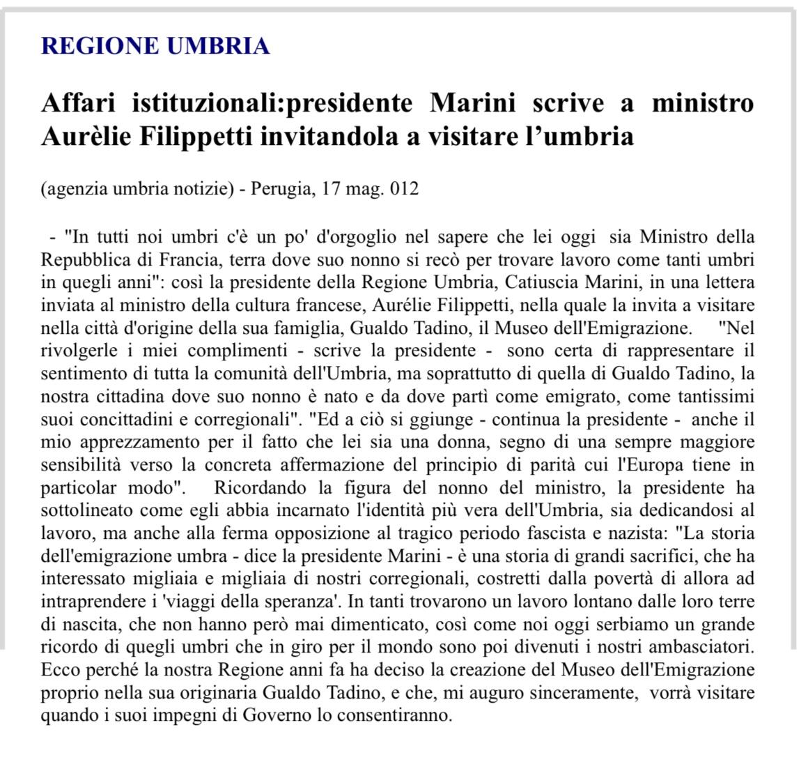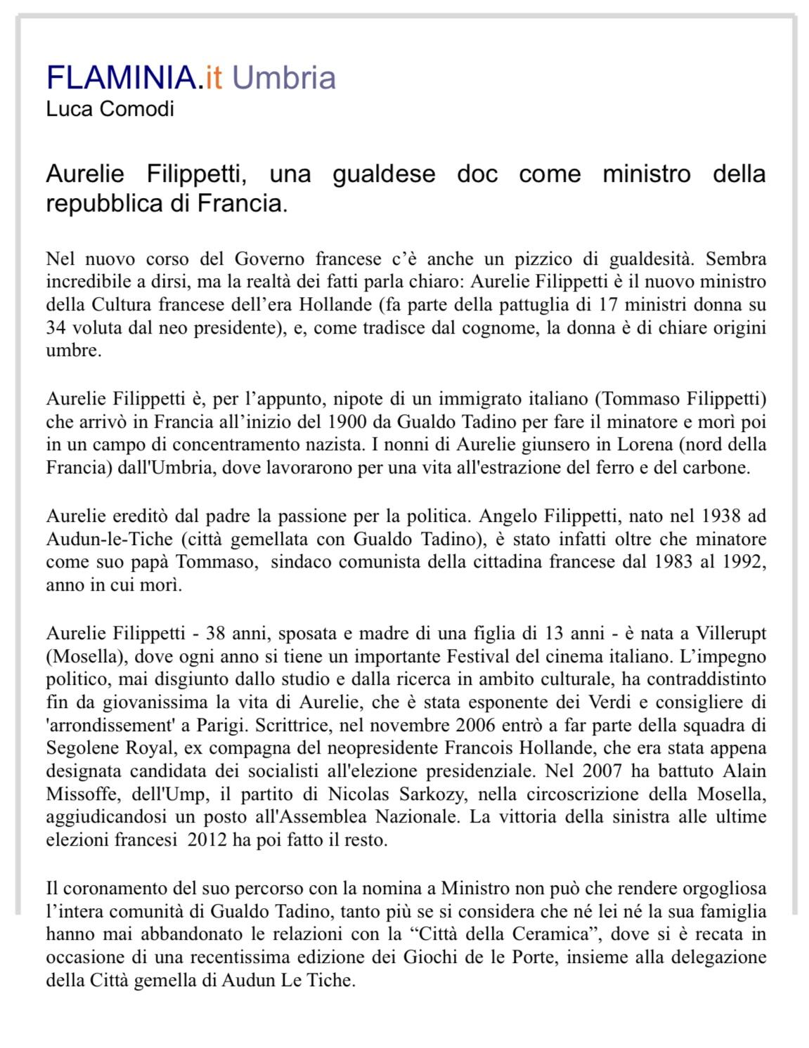 Le 23 novembre dernier, la ministre de la Culture Aurélie Filippetti était à Gualdo Tadino, le village natal de son grand-père Tommaso, mort en déportation. C’est ainsi que, 22 ans après son père Angel, la ministre française a été faite citoyenne d’honneur de notre ville jumelle en Italie.