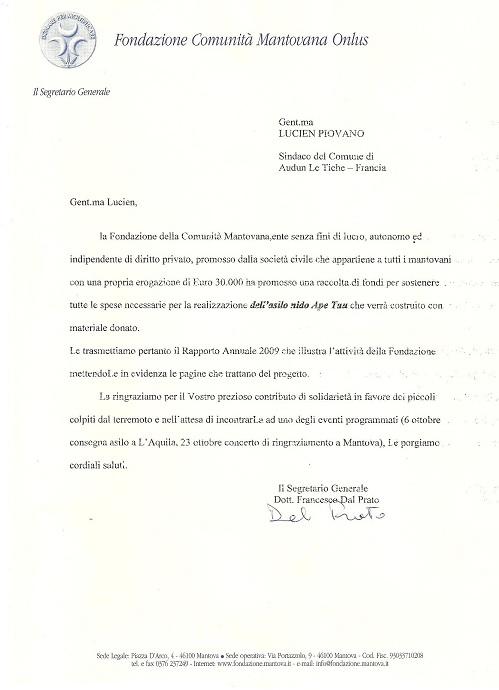 Les fonds collectés en avril 2009 à Audun le Tiche ont été virés dernièrement sur le compte bancaire de la "Fondation Mantova" pour la réalisation d'une crèche à Coppito dans les environs de L'Aquila...